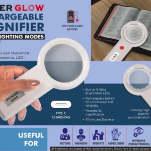 – Rechargeable Magnifier with Glowing logo plate for personalization