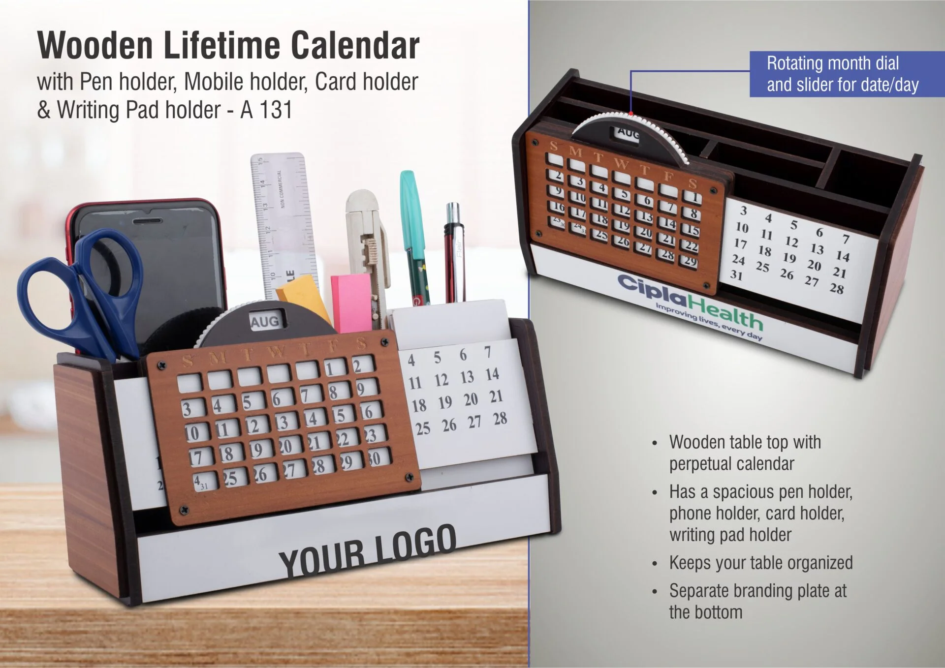 Wooden Lifetime calendar with Pen holder, Mobile holder, Card holder and Writing Pad holder | Branding included MOQ 100pc-A131